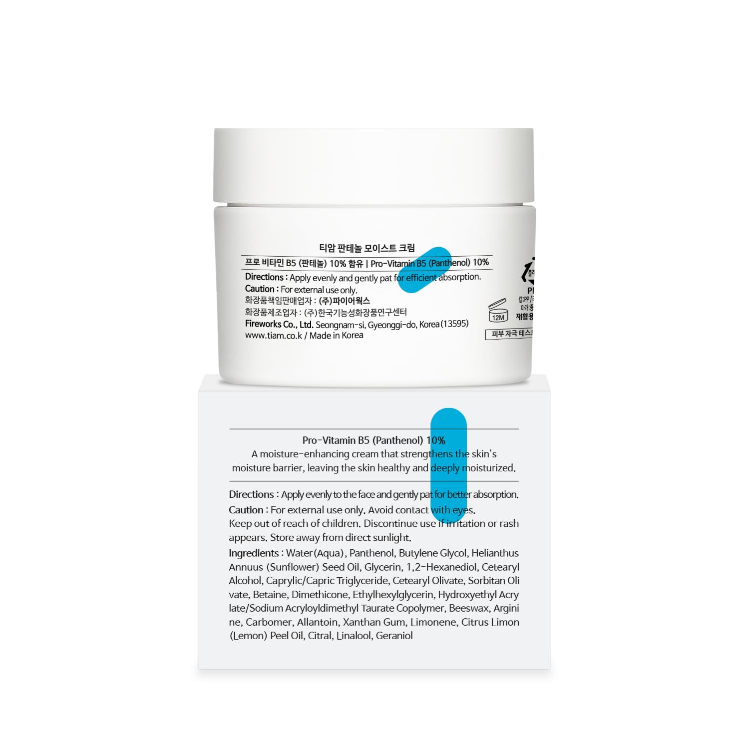 TIAM Panthenol Moist Cream formulated with 10% panthenol to hydrate skin, alongside betaine, arginine and allantoin to retain moisture and strengthen the skin barrier, this cream keeps skin supple without leaving any residue or sticky feel.
