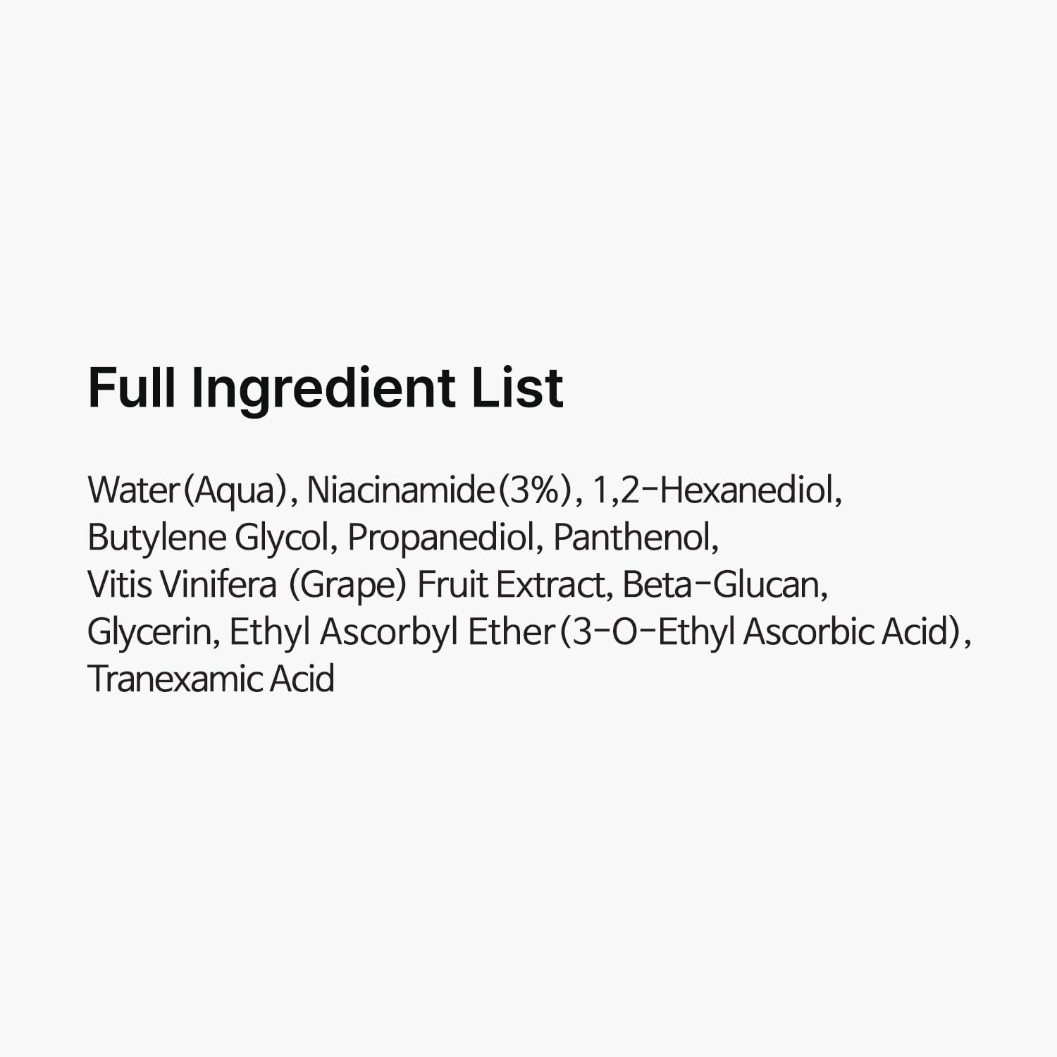 Aqua, Niacinamide (3%), 1,2-Hexanediol, Butylene Glycol, Propanediol, Panthenol, Vitis Vinifera (Grape) Fruit Extract, Beta-Glucan, Gycerin, 3-O-Ethyl Ascorbic Acid, Tranexamic Acid